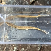 日本固有種でドジョウの一種です。比較的縞模様が濃く、点列状に並びはっきりとしています。砂に潜ることもあり、顔や尻尾が出ている姿はとても可愛らしいです。 大型のものでは10cmを超えます。 大きくなるにつれ、体長が長くなるのに加え、腹周りがプクッとしてきて堂々とした風格があり、魅力の一つです。