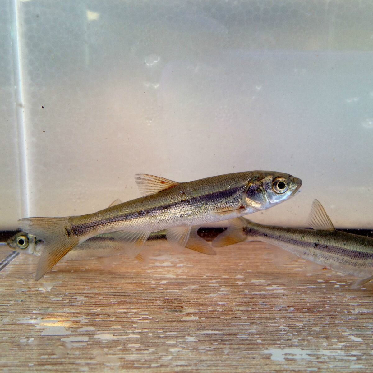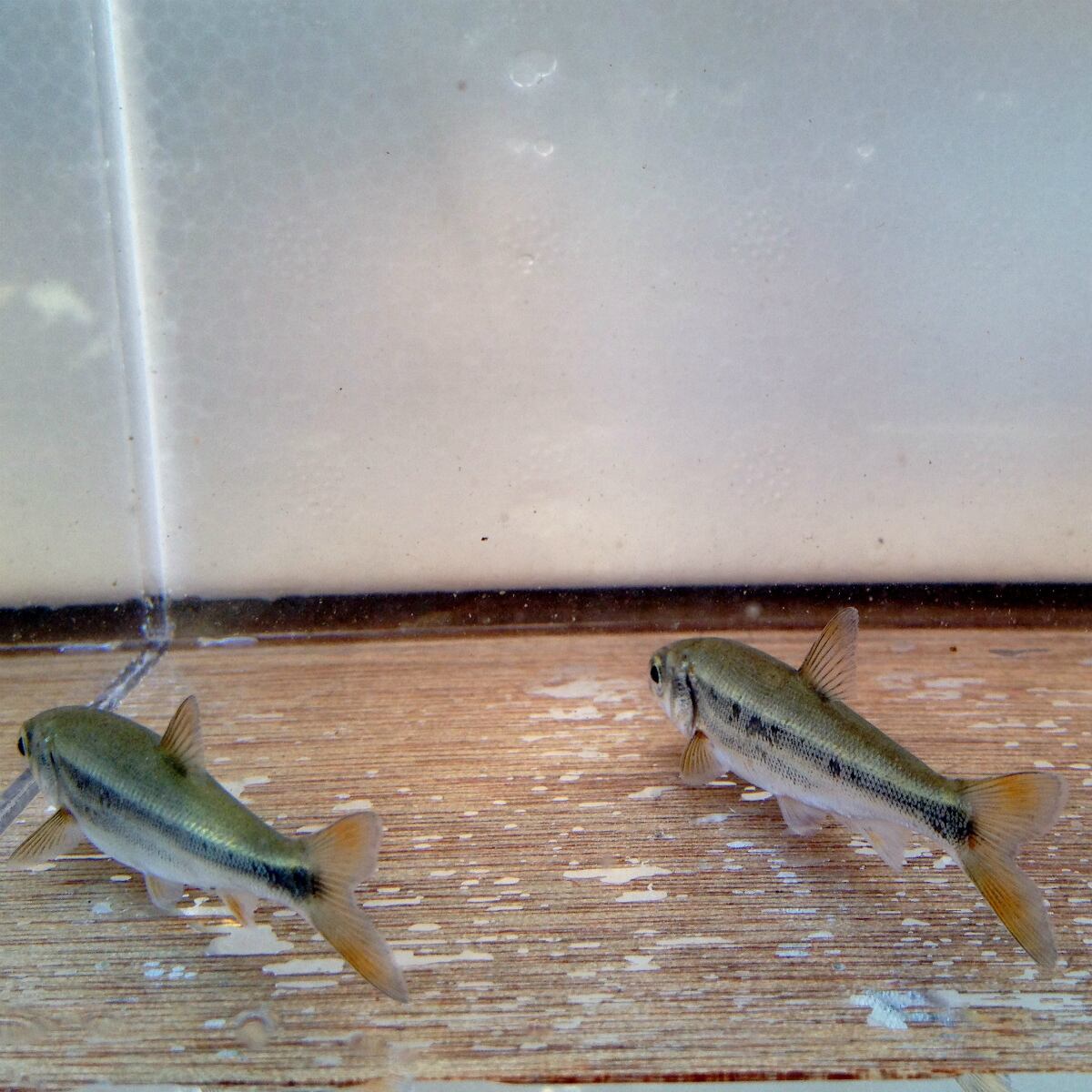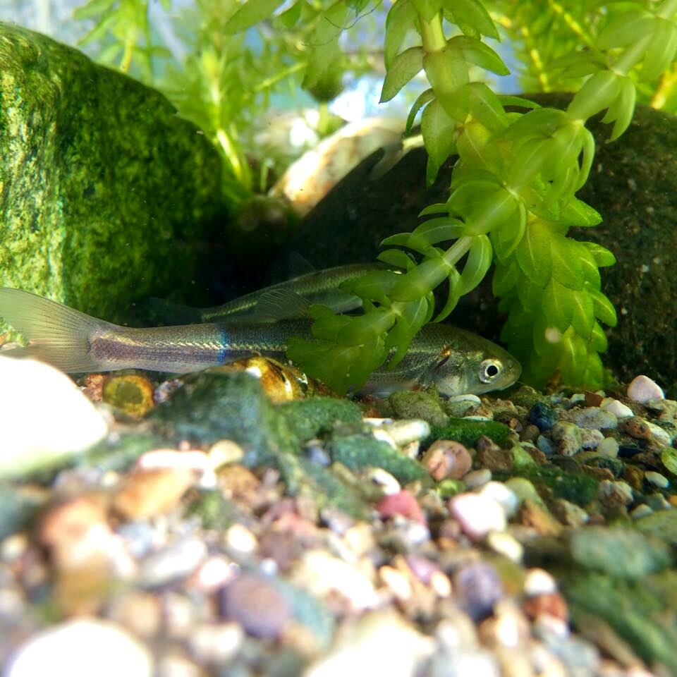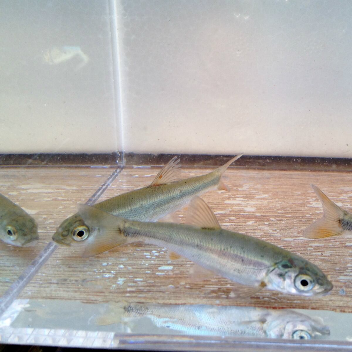 河川の上流域から河口域、湖沼、内湾にも生息していて、陸封型(純淡水性)と降海型の2型の生活パターンが知られています。北海道から九州、近隣の島嶼(とうしょ:大小さまざまな島)まで広く分布しています。銀白色の体色で、鱗は細かく、輝いています。産卵期は2~7月、雌雄ともに頬部から尾柄部にかけて色づく朱色縦帯が入ることから、”アカハラ”とも呼ばれます。1年で10cmほどになり、成熟には2年以上を要し体長25cmにもなるものもいます。さらに大型になるものでは50cmを超えるそうです。自然界では付着藻類や底生動物を主として食べていて、雑食性で何でも食べます。